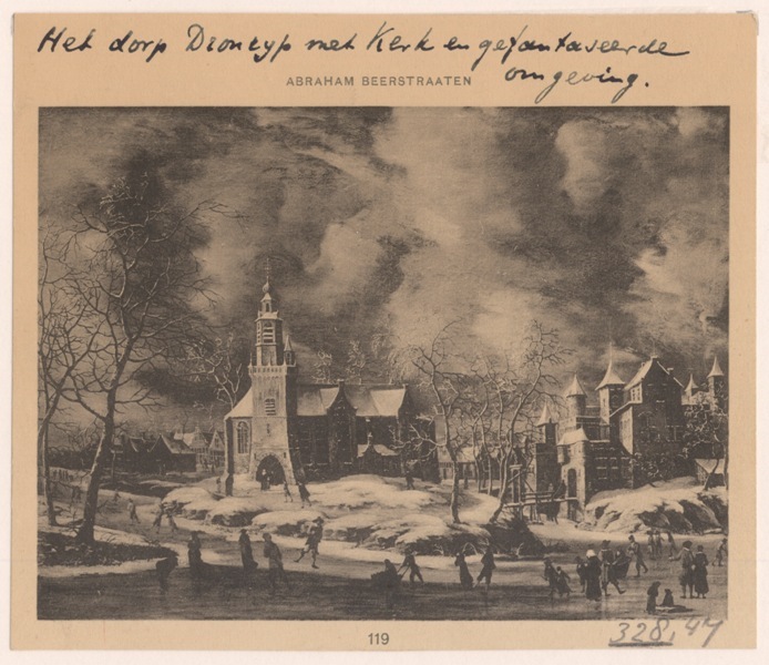 Gezicht op het dorp met kerk en gefantaseerde omgeving te Dronrijp