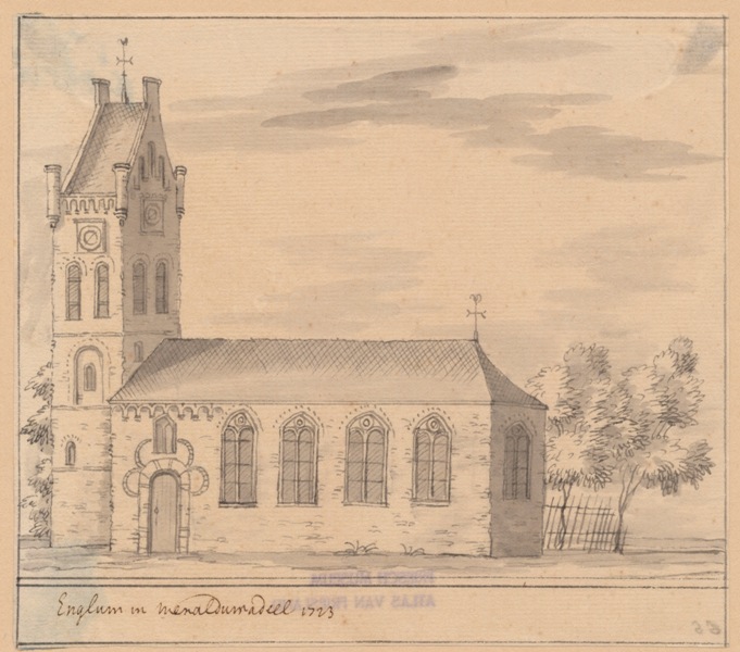 Gezicht op de kerk met stompe toren te Engelum in Menaldumadeel