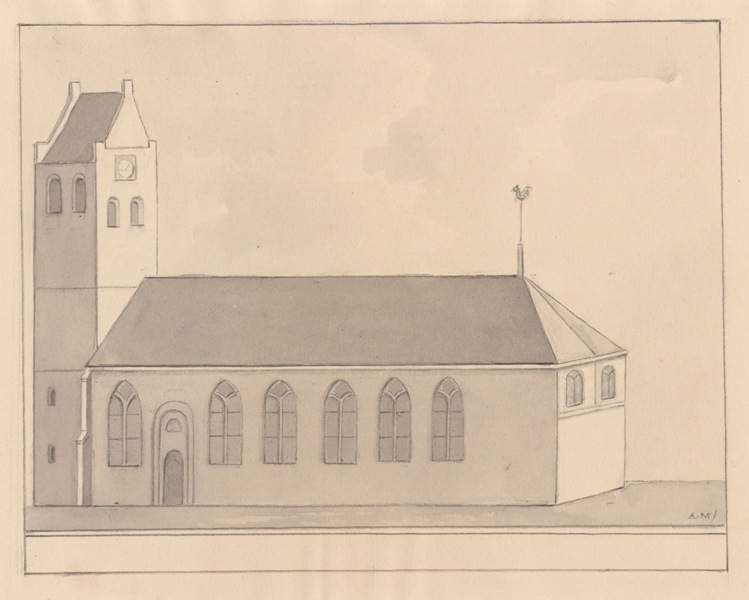 Gezicht op de kerk met stompe toren te Marssum