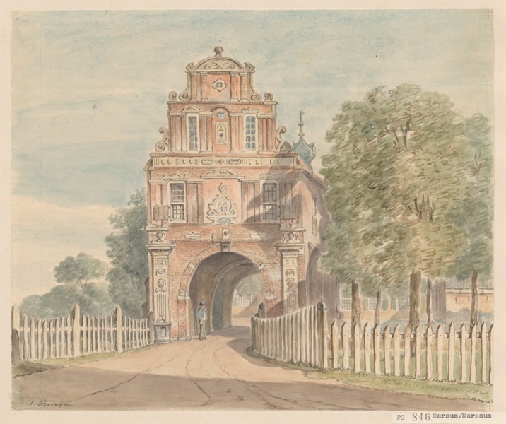 Gezicht op de hoge poort van het Popta slot te Marssum