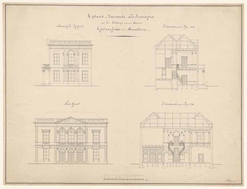 Opstand en doorsnede tekeningen van het ontwerp voor een nieuw grietenijhuis te Menaldum