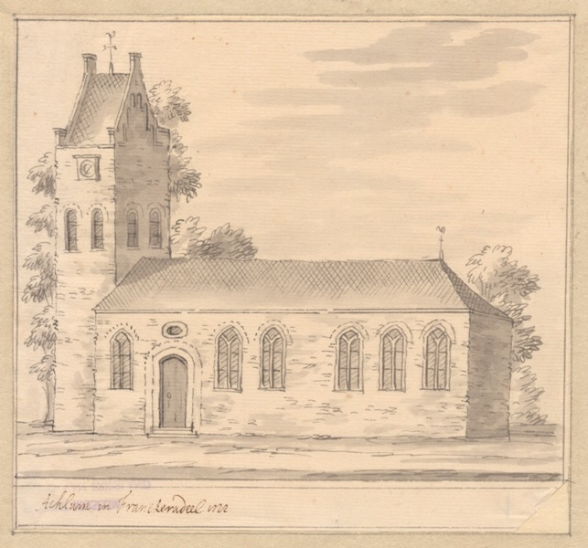 Gezicht op de kerk met stompe toren te Achlum in Franekeradeel