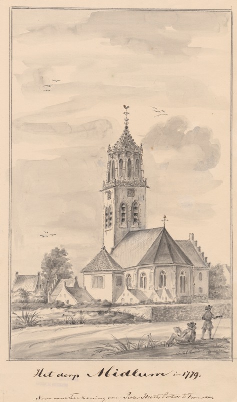 Gezicht op de toren en de kerk van het dorp Midlum