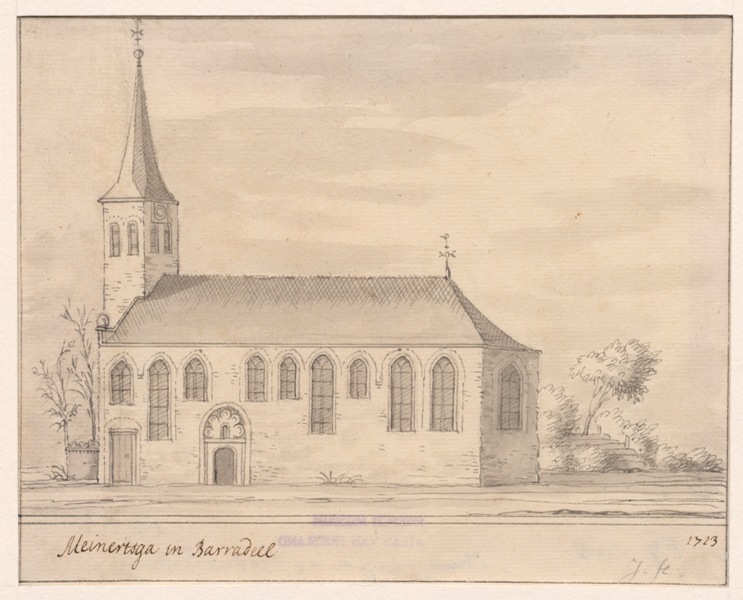 Gezicht op de kerk met spitse toren te Minnertsga in Barradeel