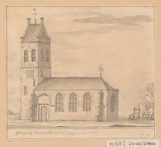 Gezicht op de kerk te Itens in Hennaarderadeel