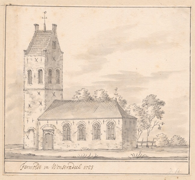 Gezicht op de kerk met stompe toren te Ferwoude in Wonseradeel