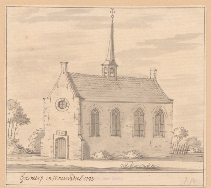 Gezicht op de kerk met spits torentje te Greonterp