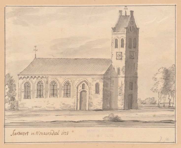 Gezicht op de kerk met stompe toren te Hartwerd in Wonseradeel