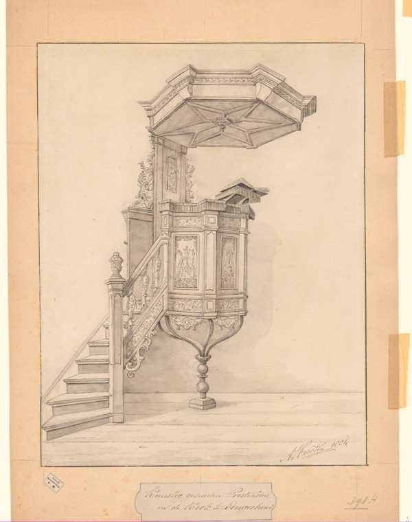 Gezicht op de preekstoel van de kerk te Longerhouw