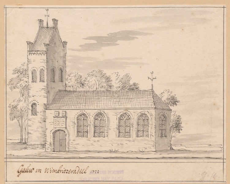 Gezicht op de kerk met stompe toren te Gauw in Wymbritseradeel
