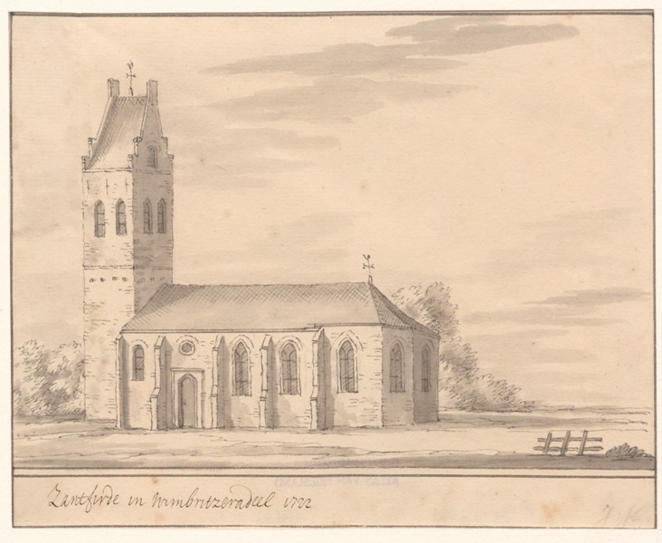 Gezicht op de kerk te Sandfirden in Wymbritseradeel