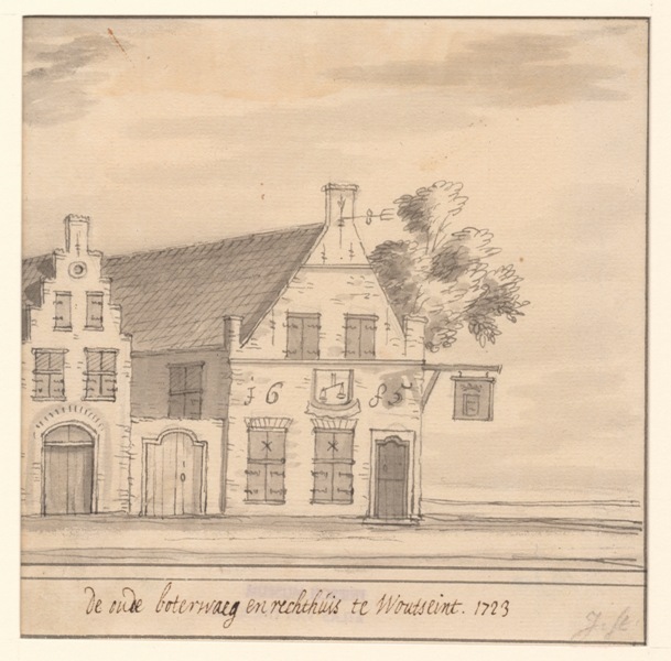Gezicht op de oude Boterwaag en het Rechthuis te Woudsend