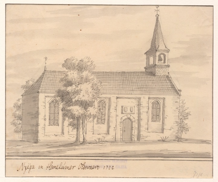 Gezicht op de kerk met spits torentje te Nijega