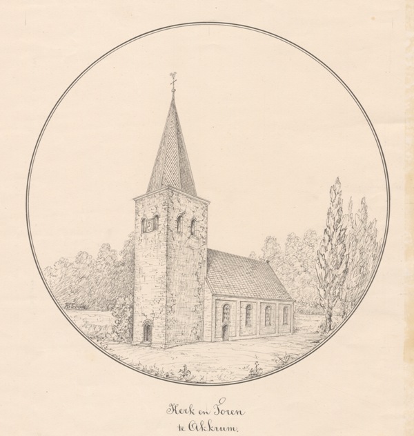 Gezicht op de kerk met spitse toren te Akkrum in Utingeradeel