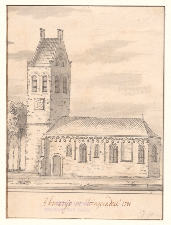 Gezicht op de kerk met stompe toren te Akmarijp in Utingeradeel