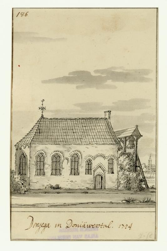Gezicht op de kerk met klokstelling te Doniaga in Doniawerstal