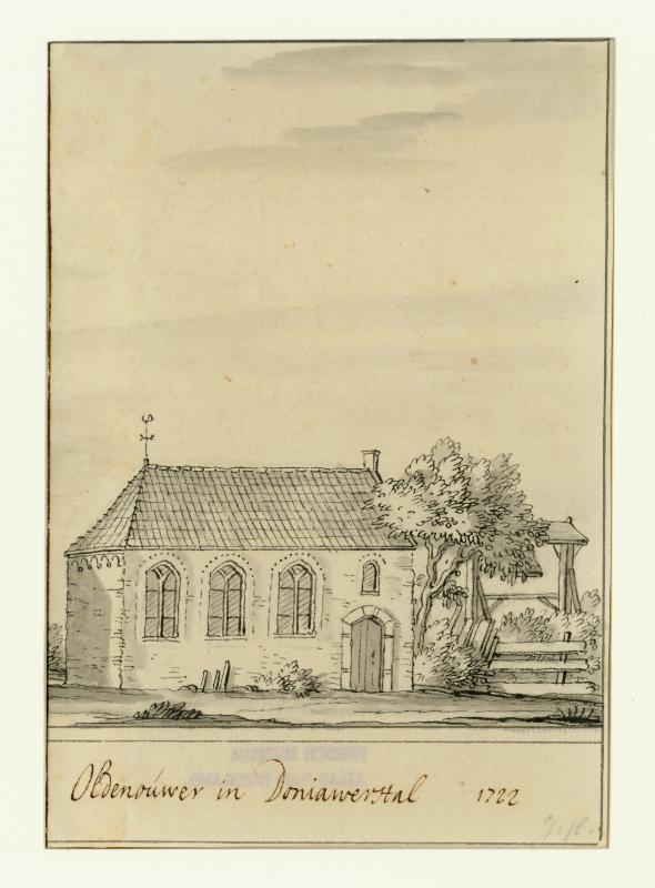 Gezicht op de kerk met klokstelling te Oldeouwer in Doniawerstal