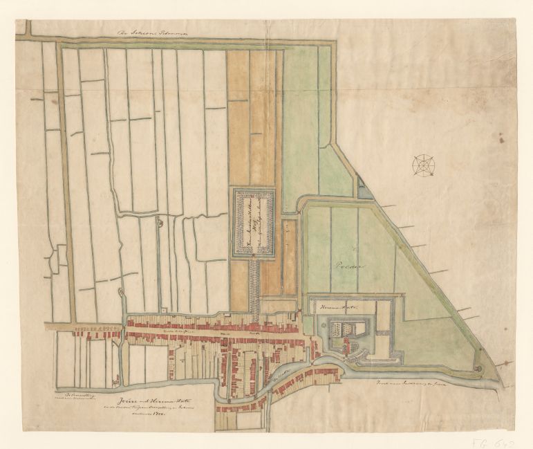 Plattegrond met Heremastate te Joure en de landen tussen de Overspitting en de Scheen omstreeks 1700