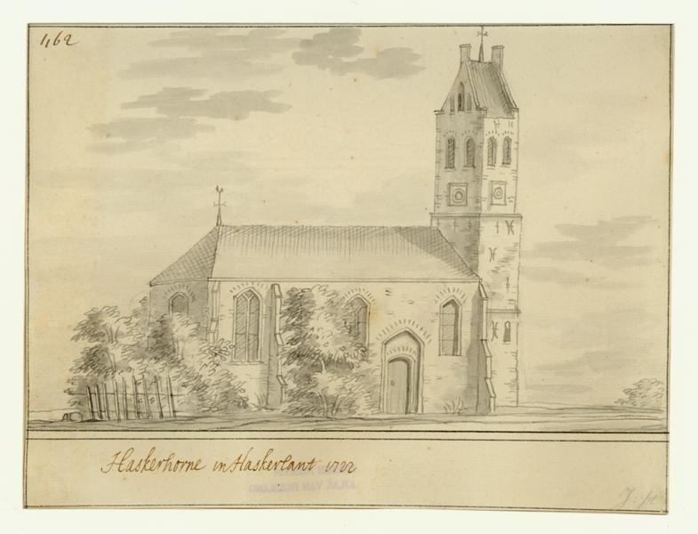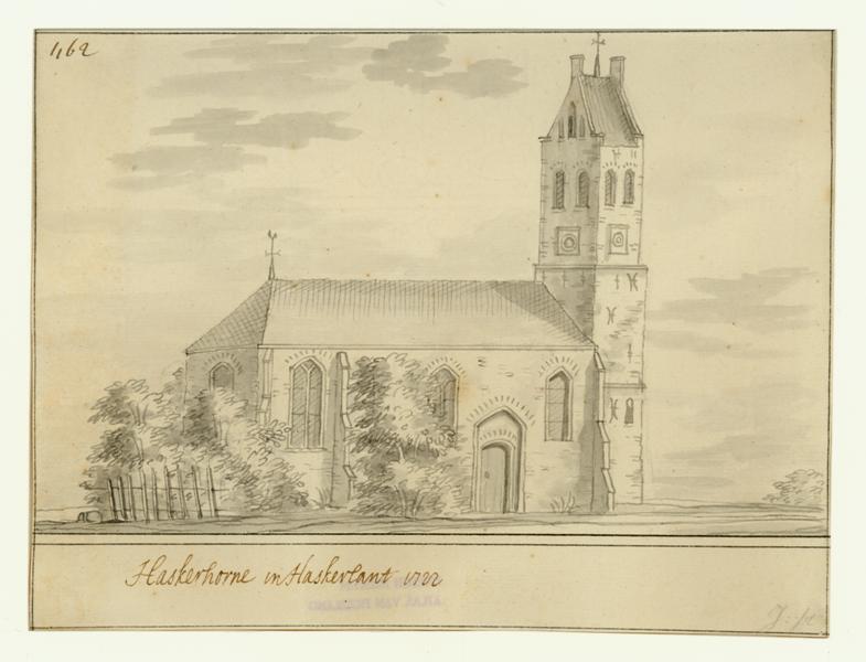 Gezicht op de kerk met stompe toren te Haskerhorne