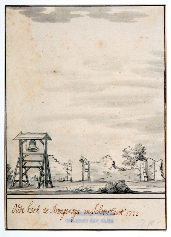 Overgebleven muurwerk van de oude kerk met klokstelling te Brongerga in Schoterland