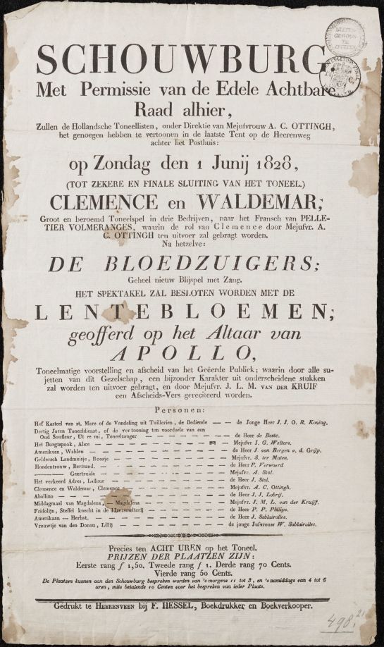 Programma van de opvoering door de Hollandsche Toneellisten van de stukken Clemence en Waldemar, De Bloedzuigers en Lentebloemen geofferd op het Altaar van Apollo, in de tent op de Heerenweg op 1 juni 1828