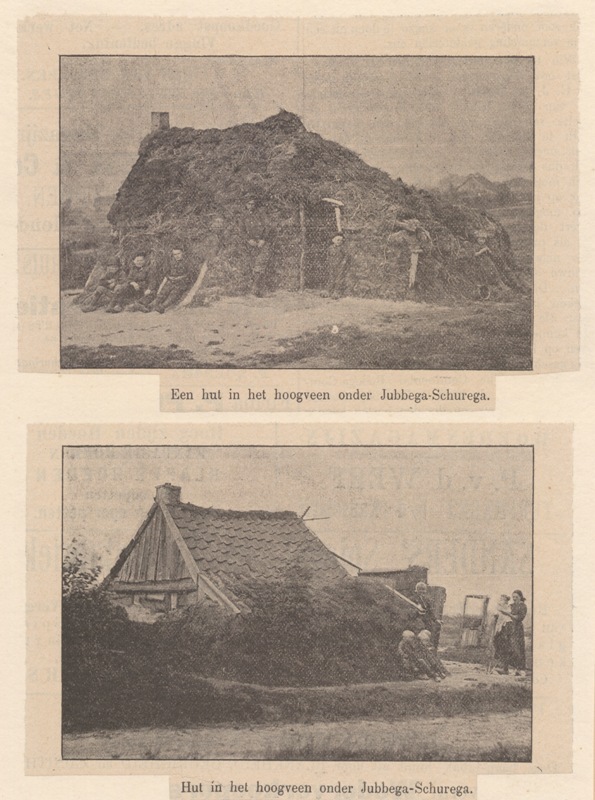 Gezicht op twee hutten in het hoogveen te Jubbega