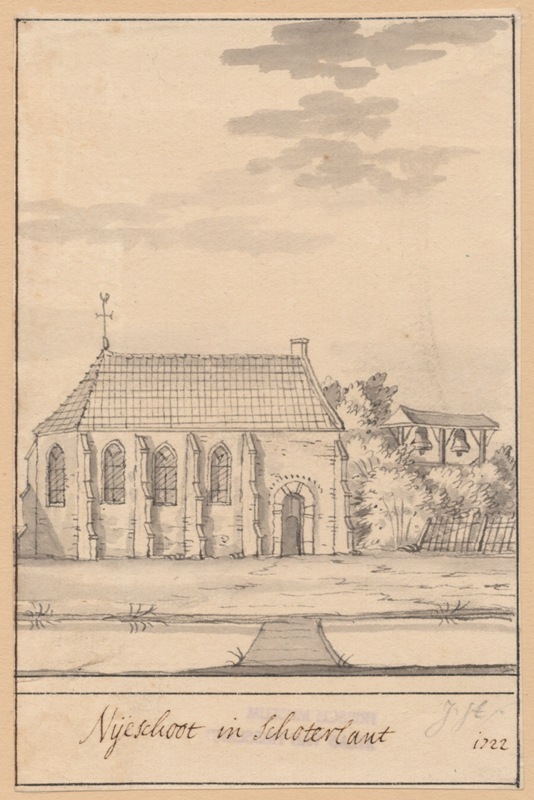 Gezicht op de kerk met klokstelling te Nieuweschoot in Schoterland