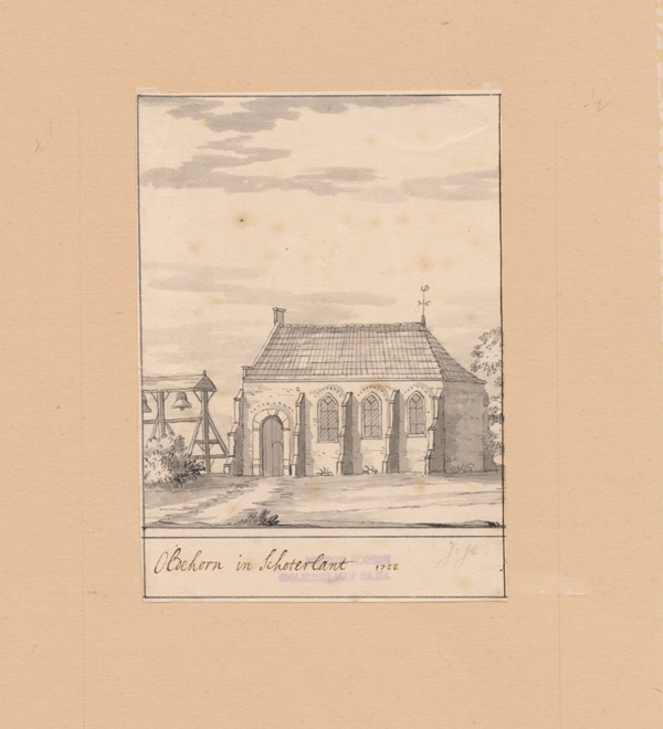 Gezicht op de kerk met klokstelling te Oudehorne in Schoterland