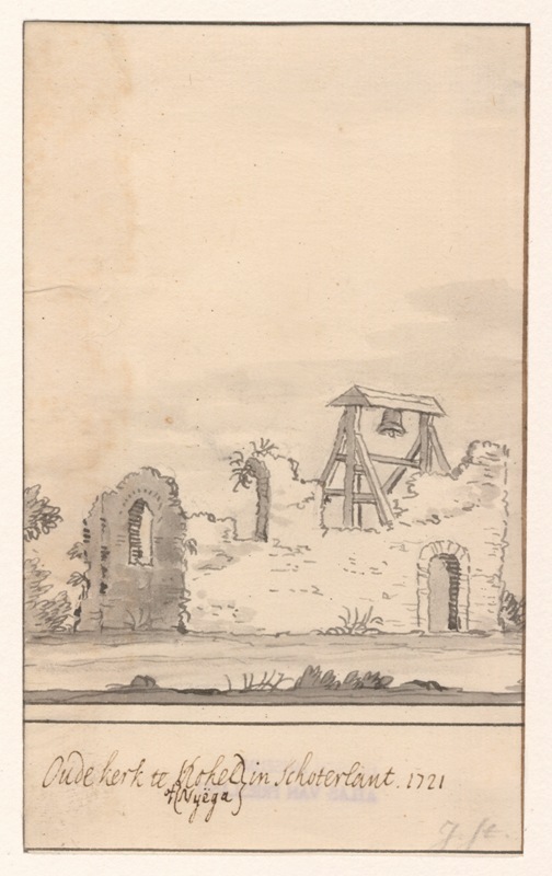 Gezicht op overblijfselen van de oude kerk te Rohel/Nijega in Schoterland