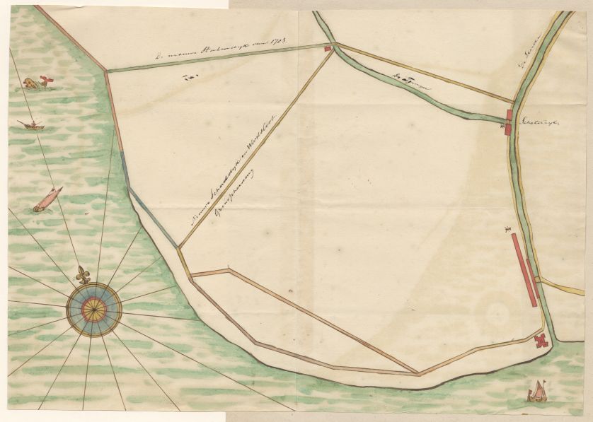Kaart van de Kuinder, Slijkenburg en Schoterzijl met de dijkaanleg van 1703
