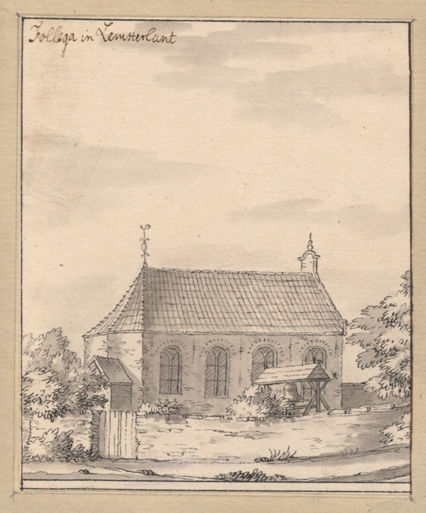 Gezicht op de kerk met klokstelling te Follega in Lemsterland