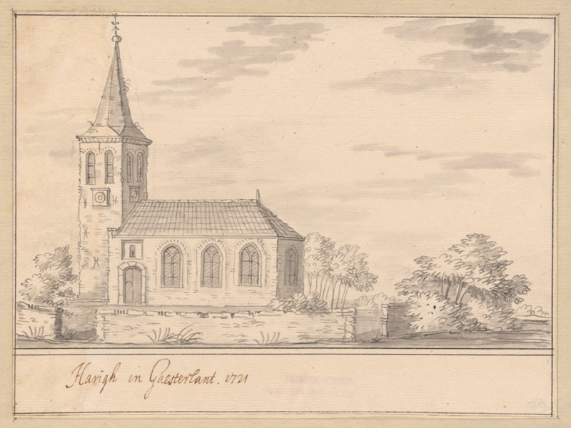 Gezicht op de kerk met spitse toren te Harich in Gaasterland