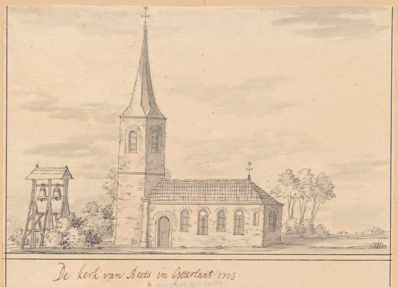 Gezicht op de kerk met spitse toren en klokstelling te Beets