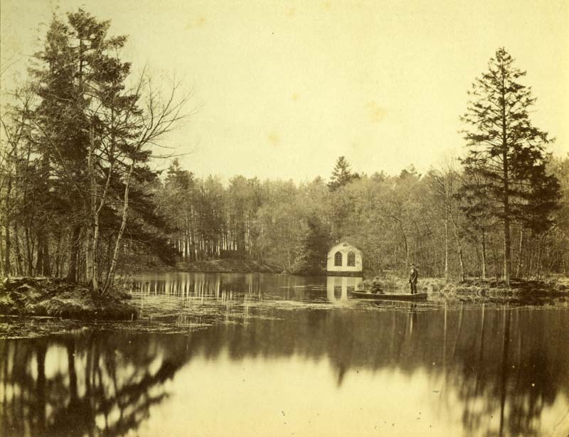 Gezicht op de grote vijver en kluizenaarshut in het bos van de familie Boelens te Olterterp