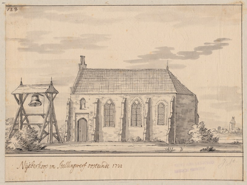 Gezicht op de kerk met klokstelling te Nijeberkoop in Oost-Stellingwerf