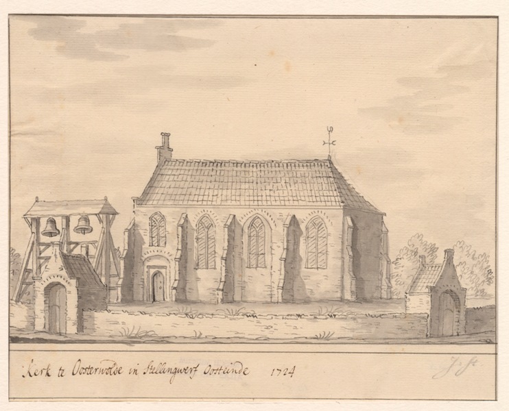 Gezicht op de kerk met klokstelling te Oosterwolde in Oost-Stellingwerf