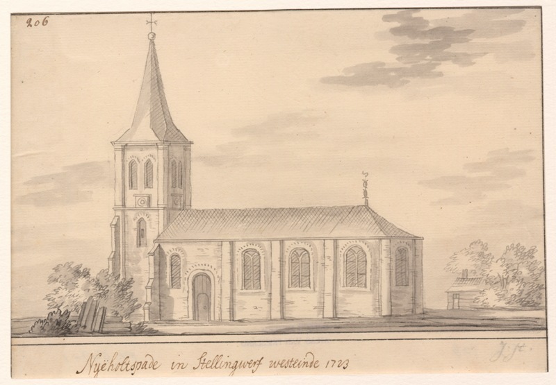Gezicht op de kerk met spitse toren te Nijeholtpade in West-Stellingwerf
