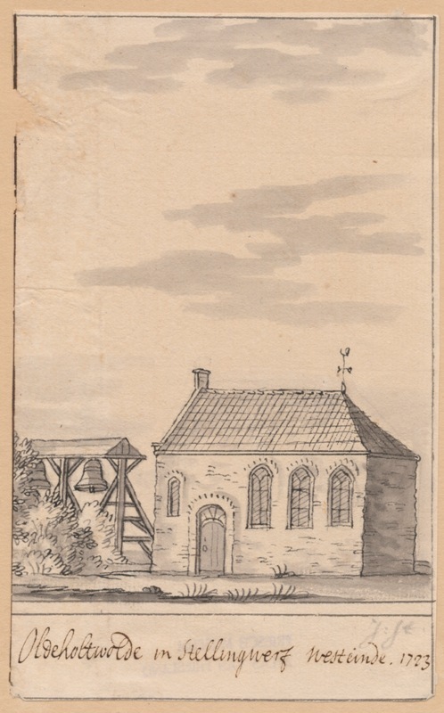 Gezicht op de kerk met klokstelling te Oldeholtwolde