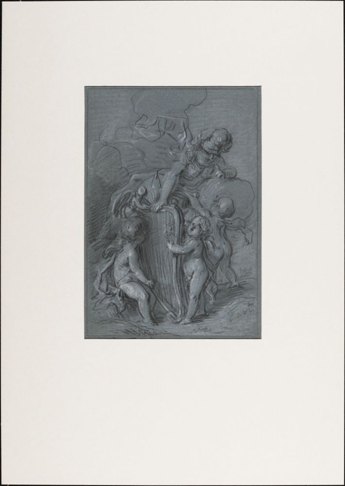 Minerva omringd door geniën zittend op een wolk; allegorie op de muziek