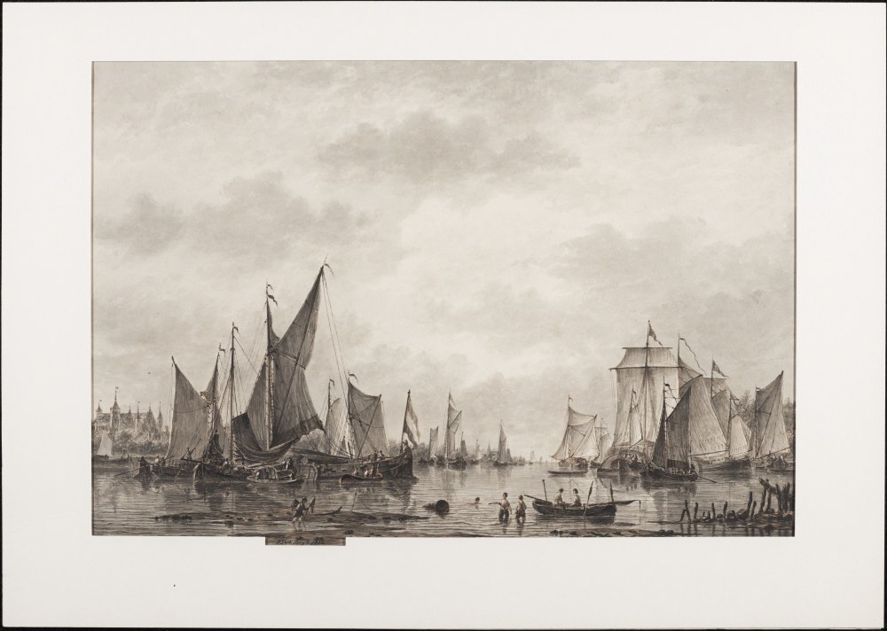 Schepen op een rivier voor een kasteel met zwemmers op de voorgrond
