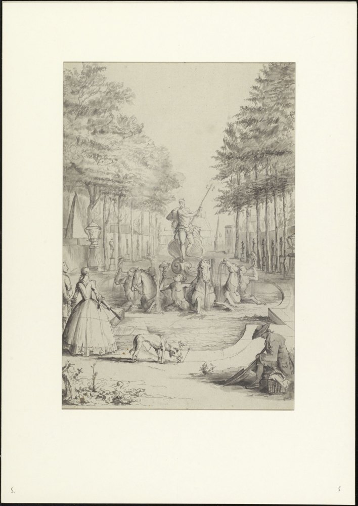 Gezelschap in tuin met fontein met Neptunus