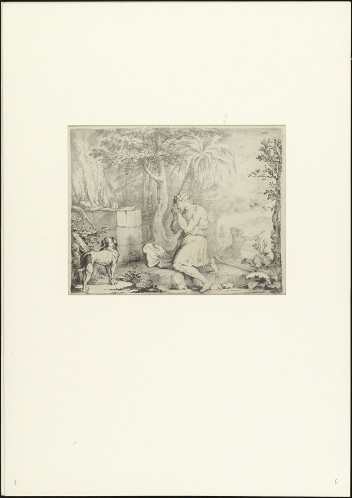 Herder biddend voor altaar met brandoffer (Kaïn en Abel?)