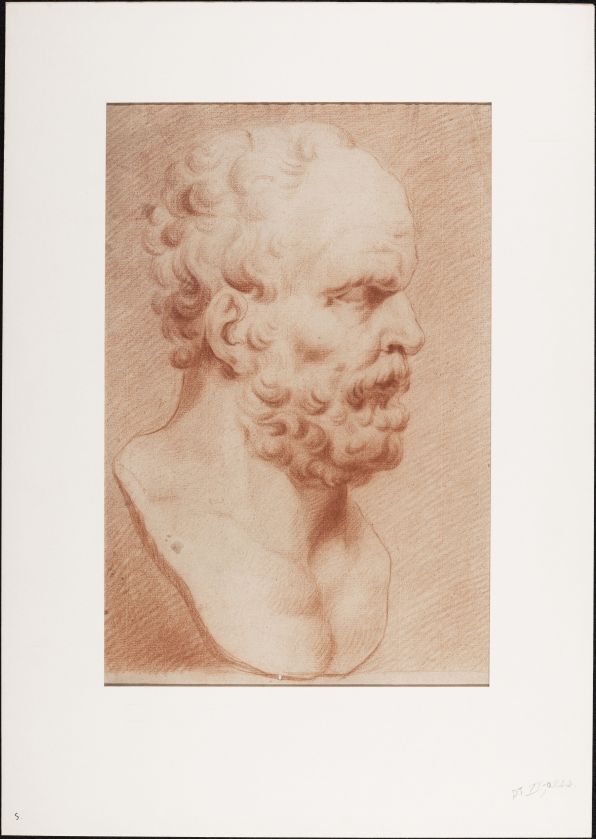 Beeld van de kop van een man met krullend haar en baard, in profiel