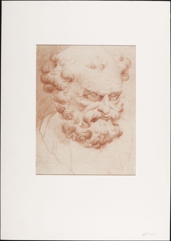 Beeld van de kop van een man met krullend haar en baard, nors klijkend