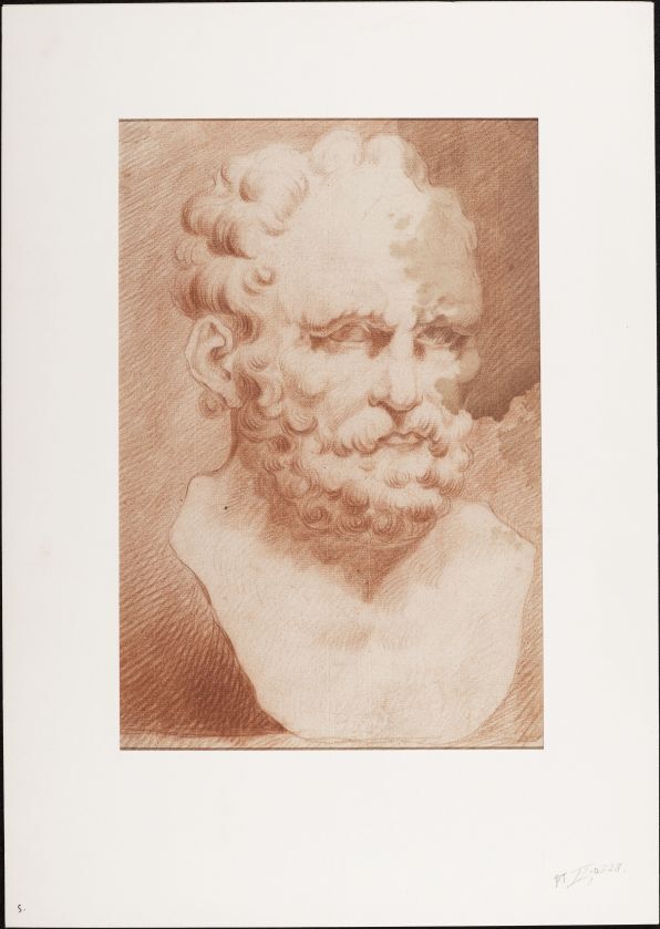 Beeld van de kop van een man met krullend haar en baard