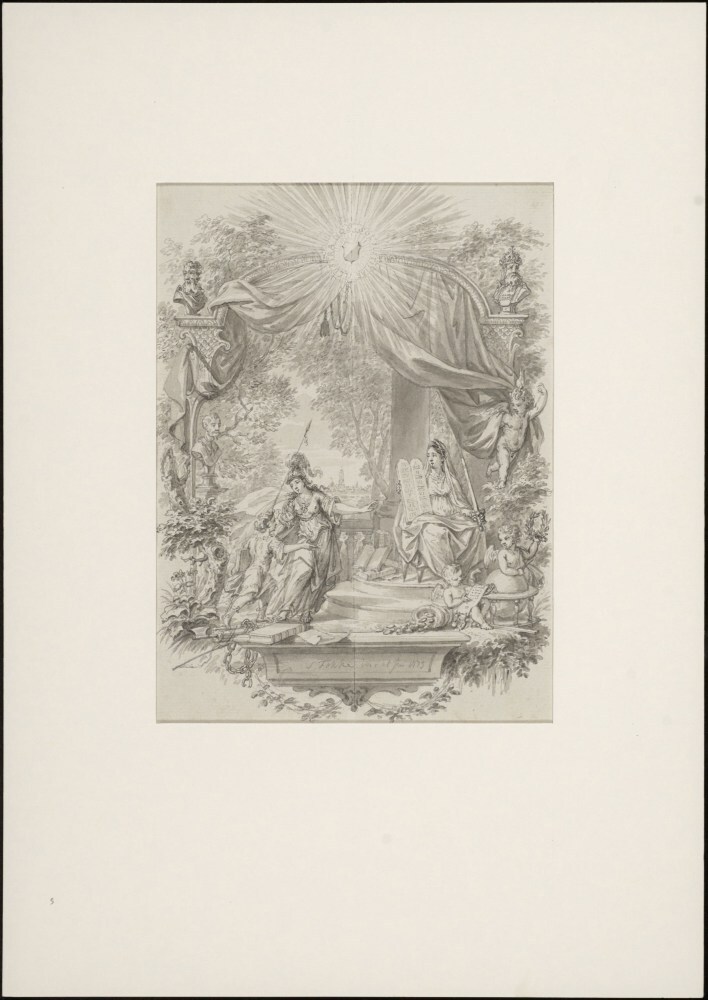 Ontwerp voor een titelplaat met Jusitia en Minerva