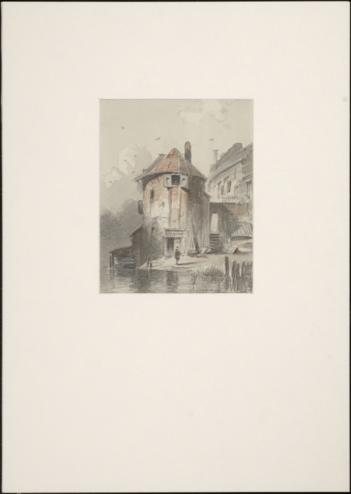 Stadsgezicht met toren; verso: schets met stadsgezicht