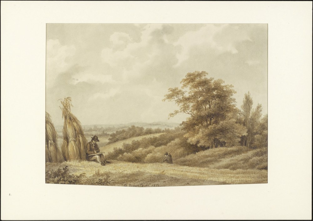 Landschap met op de voorgrond een tekenaar