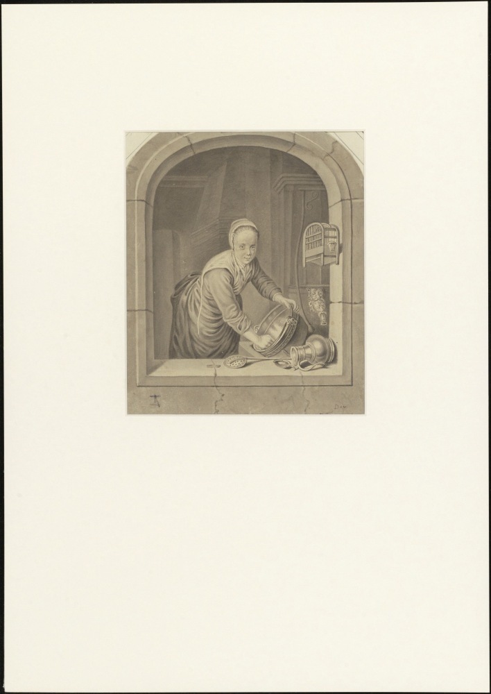 Keukeninterieur met meid, die pan schuurt