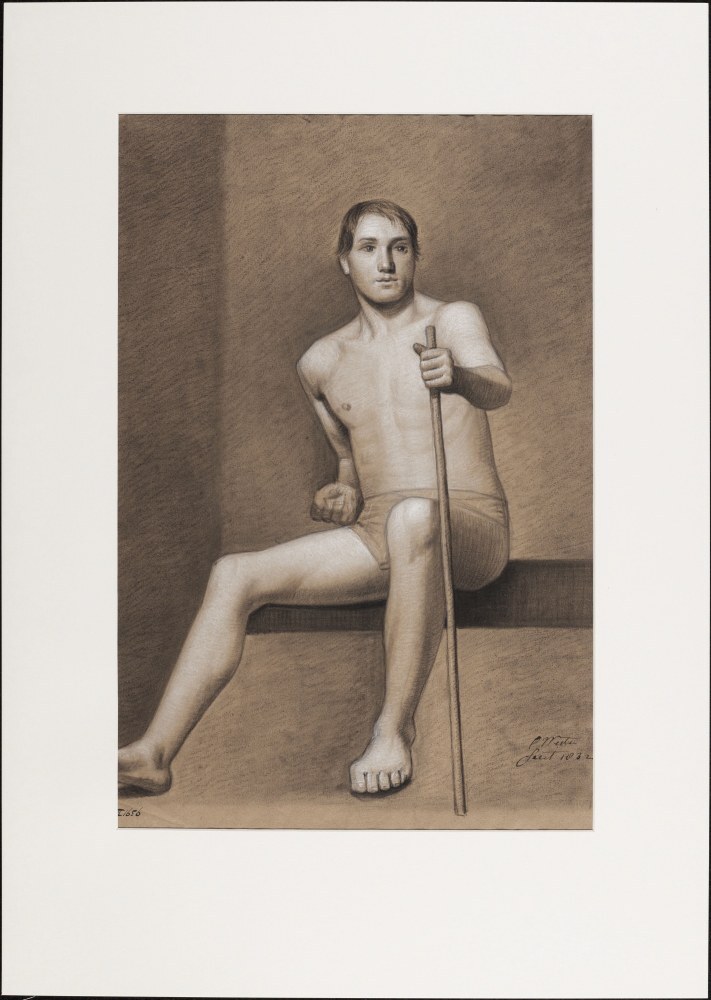 Zittende man met stok in de linkerhand